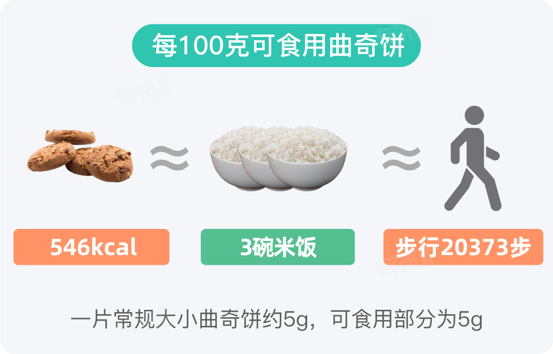 曲奇饼的可食用部分g重因品牌、种类和大小而异,但一般而言,一块中等大小的曲奇饼约为5-10g。以每100g曲奇饼热量546kcal,一块5g的曲奇饼热量约为27kcal,如果一包95g的曲奇饼全部吃完,则相当于吃了将近3碗米饭的热量。因此,在享受曲奇饼的美味时,消费者应留意热量的摄入,避免过量食用。
