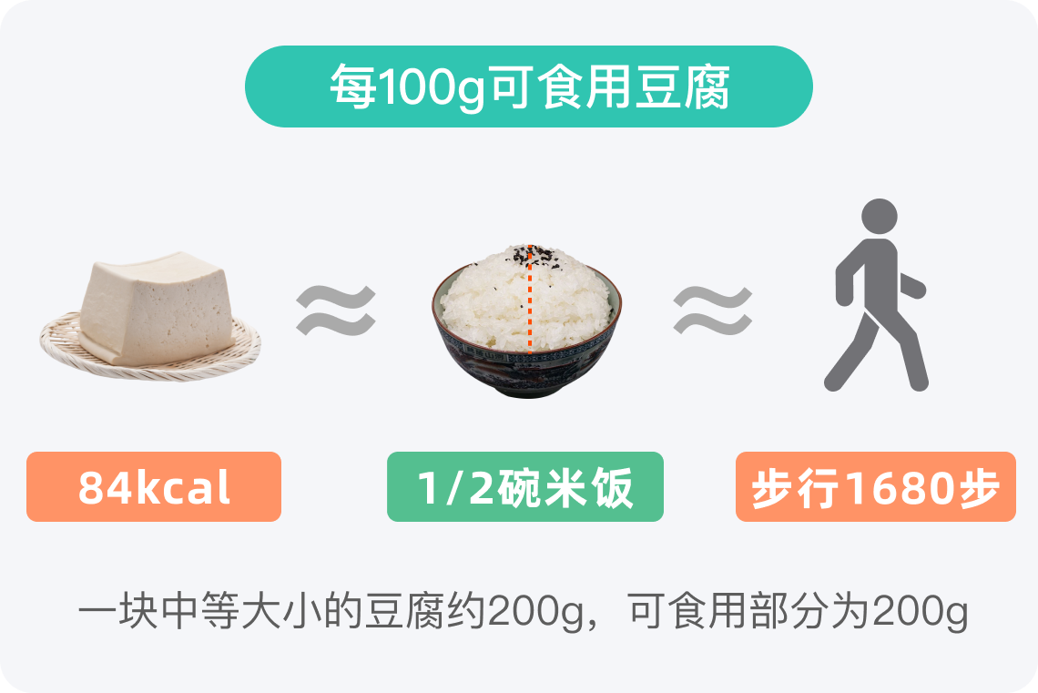 一块中等大小的豆腐约200g,热量约为168kcal,约相当于0.9碗米饭。对于部分成年人一餐500-800kcal的热量需求而言,所占比例适中。