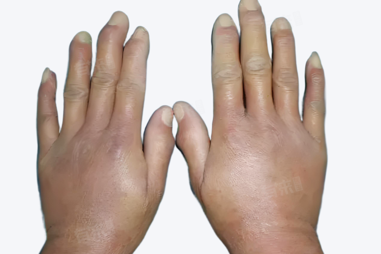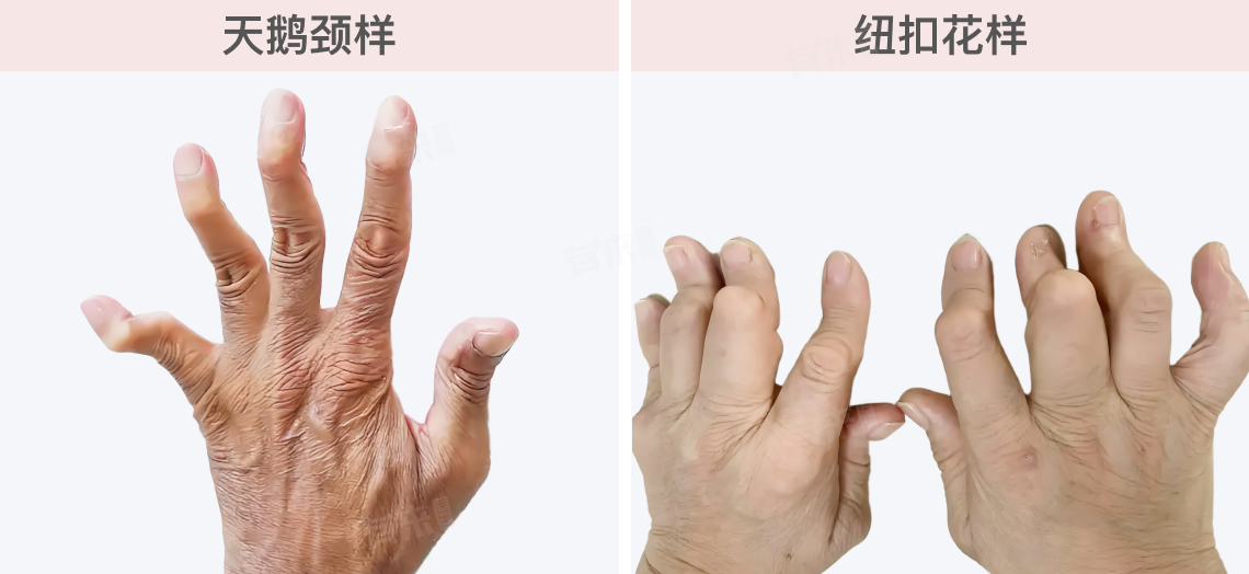 4、畸形:长期的风湿病可导致关节软骨、骨质破坏,关节周围肌肉萎缩而引起关节畸形。如类风湿关节炎晚期患者可出现手指关节的天鹅颈样畸形、纽扣花样畸形等,严重影响关节功能。