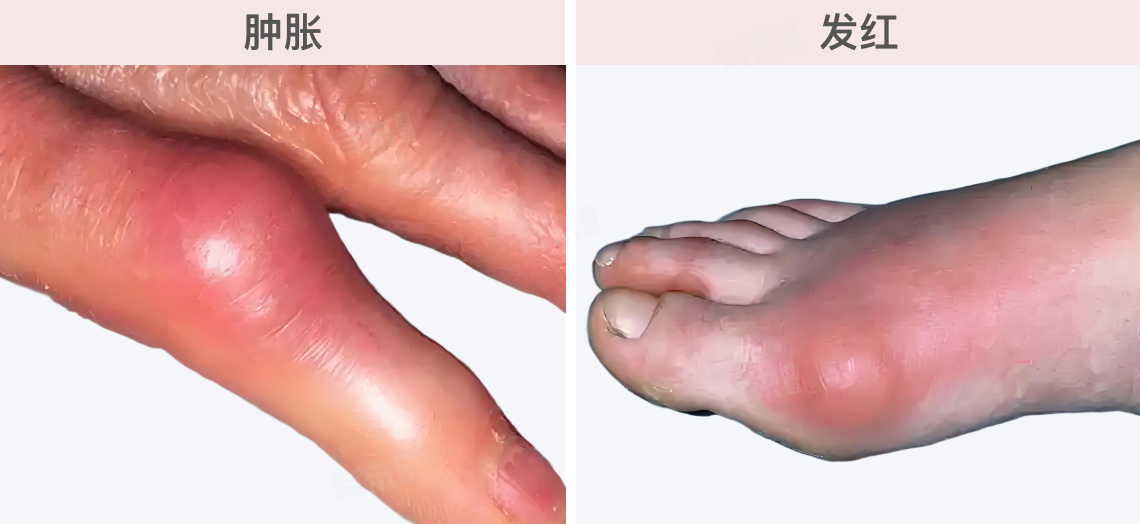 2、肿胀:关节周围组织因炎症反应出现肿胀,表现为关节周围皮肤发红、发热,关节外形肿大,活动受限。如痛风性关节炎急性发作时,受累关节常迅速出现红肿热痛,肿胀明显,疼痛剧烈。