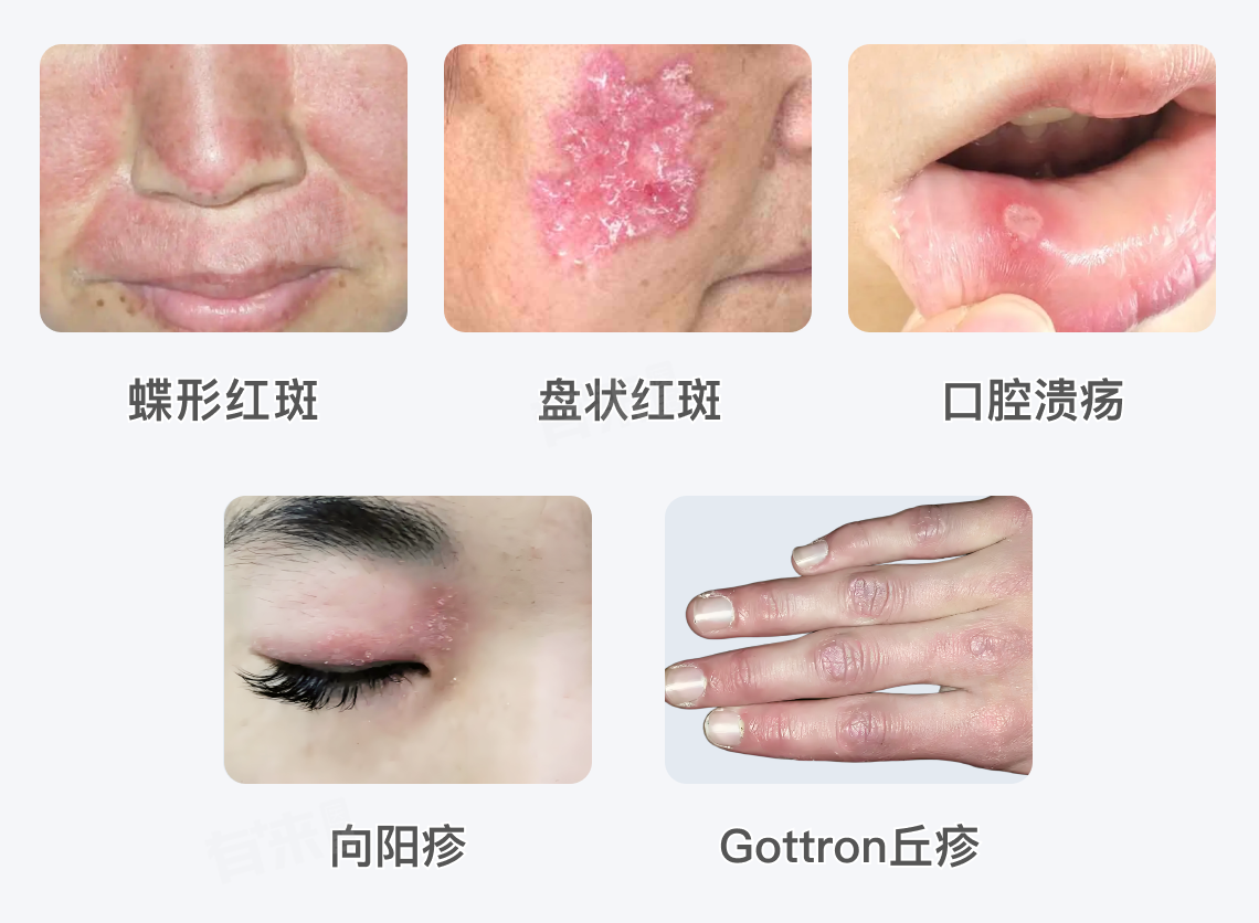 1、皮疹:多种风湿病会出现不同类型的皮疹。如系统性红斑狼疮患者可出现面部蝶形红斑,横跨鼻梁和双侧脸颊,形似蝴蝶;还可能出现盘状红斑、光过敏、口腔溃疡等皮肤黏膜表现。皮肌炎患者则常在上眼睑出现紫红色斑,伴有水肿,称为向阳疹,还可在关节伸侧出现Gottron丘疹等特征性皮疹。