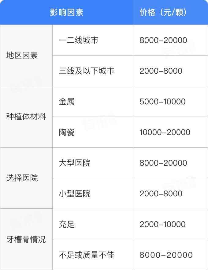 如果选择在大型医院进行种植,因为仪器比较充足,所以价格也会相对高一些,可能是8000-20000元/颗,选择其他医院的时候,价格会低一些,只需要2000-8000元/颗。