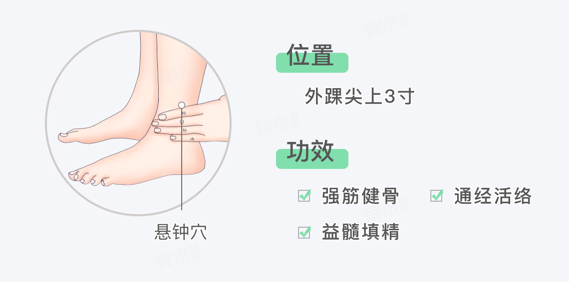 1、强筋健骨:悬钟穴归属于足少阳胆经,与人体的筋骨系统有着密切的联系,刺激悬钟穴能够调节肝胆经的气血运行,从而起到强筋健骨的作用。