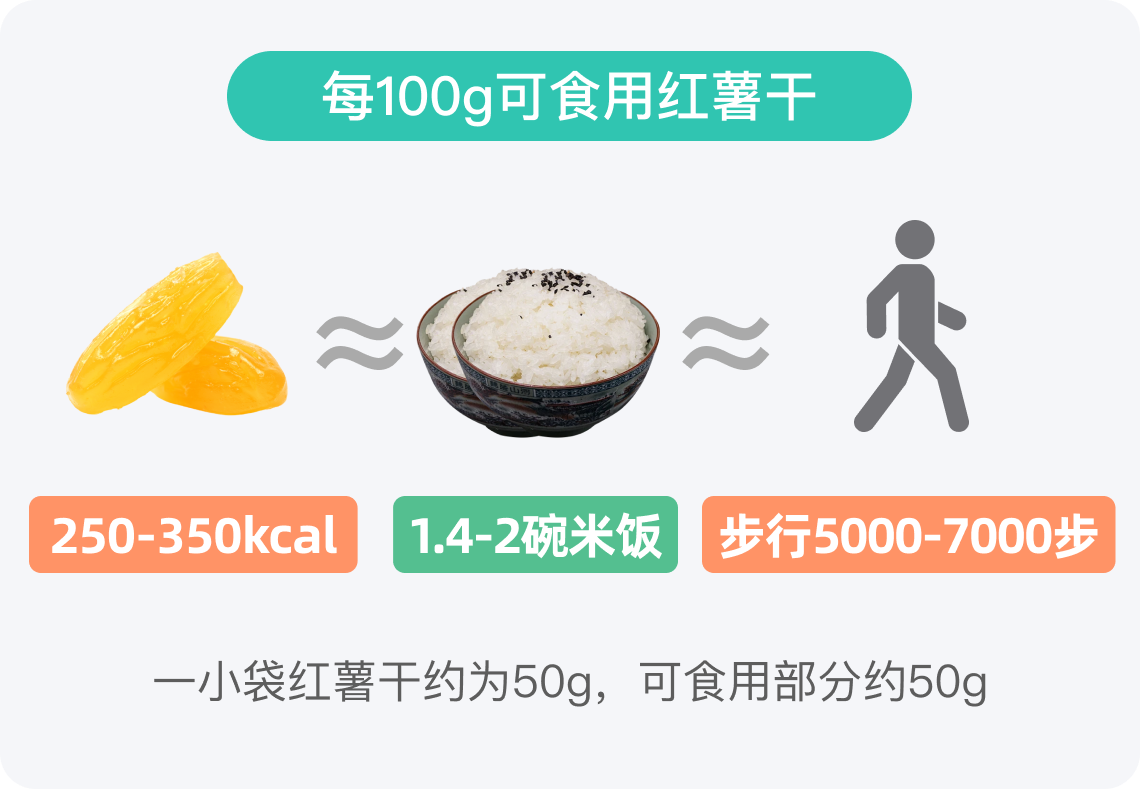一小袋红薯干的可食用部分约为50g,其热量约为125-175kcal,每食用50g相当于消耗了约0.7-1碗米饭的热量。一小袋红薯干的热量虽然看似不高,但作为零食频繁食用,仍需注意热量累积效应。