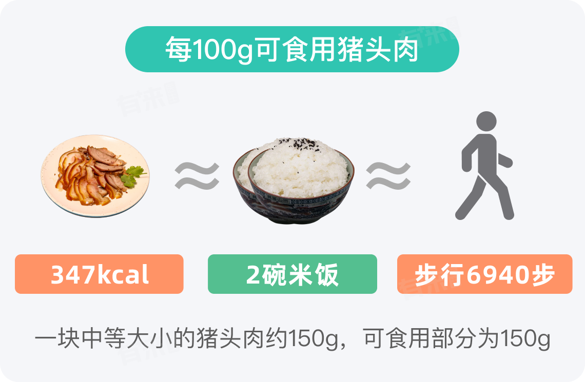 每100g猪头肉热量约347kcal,一块中等大小的猪头肉可食用部分约150g,热量为521kcal,这些热量相当于3碗米饭。对于成人而言,如果一餐中摄入了150g猪头肉,其热量占比会相对较高,占成人每日推荐摄入热量的25%左右。