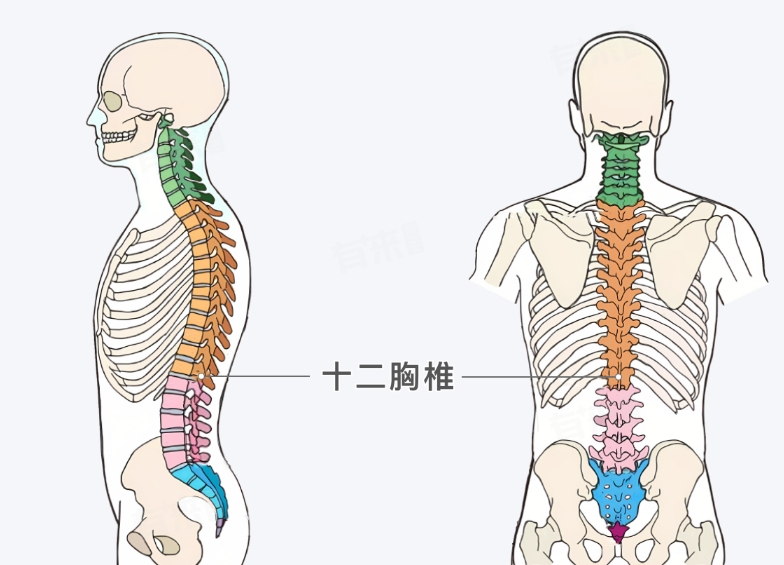 胸12椎体,即第十二胸椎(T12),位于人体脊柱的中部,胸腰部的交界处,是胸椎段的最后一个椎骨。在体表上,它大致位于后腰部的上方,背部正中间的位置。