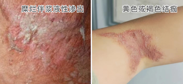 3、皮肤糜烂与结痂:当水疱或脓疱破裂后,皮肤表面会出现糜烂面,糜烂面的大小与之前的水疱、脓疱分布范围相关,可呈片状或点状,糜烂面有浆液性渗出,渗出物干燥后会形成黄色或褐色的结痂。