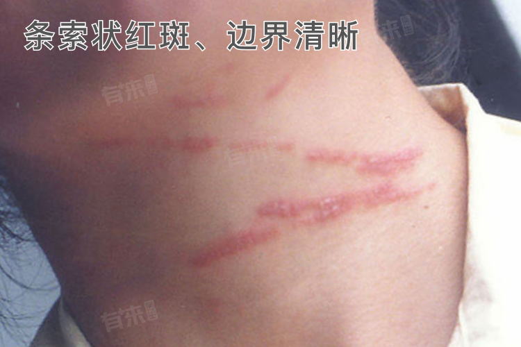 1、红斑:隐翅虫毒液接触皮肤后,因为毒液对皮肤产生强烈的刺激,导致局部皮肤血管扩张,通透性增加,血液成分渗出到周围组织间隙,通常会在数小时至一天内出现症状,初期皮肤会出现条索状、斑片状或点状的水肿性红斑,红斑边界清晰,形态多不规则,