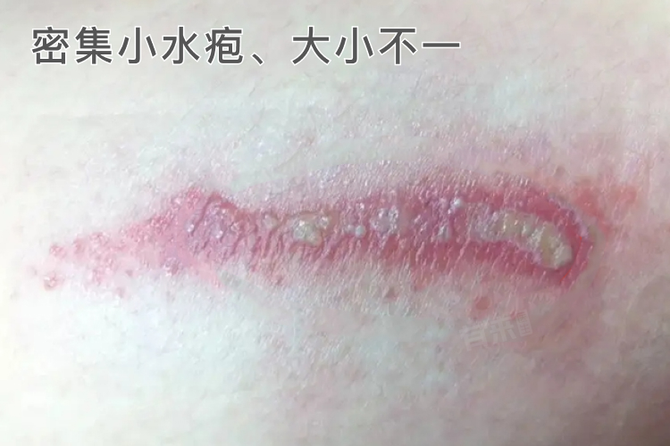2、水疱与脓疱:在红斑基础上,常会迅速发展出密集的小水疱,水疱大小不一,可呈米粒至绿豆般大小,疱液清澈或略显浑浊,若水疱继发感染,疱液会变得浑浊,形成脓疱,脓疱周围皮肤往往会有明显的红晕,且伴有疼痛和压痛。
