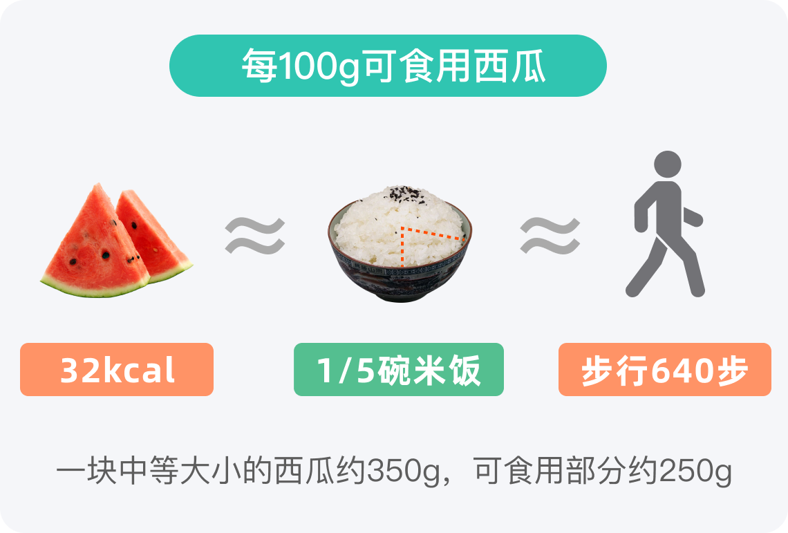 西瓜是夏季受欢迎的水果之一,每100g西瓜的热量约为32kcal,一块可食用西瓜重量约为250g,热量大约为80kcal,主要来源于碳水化合物以及少量蛋白质。相对于许多高热量的食物来说,西瓜热量相对较低,适合各类人群食用。