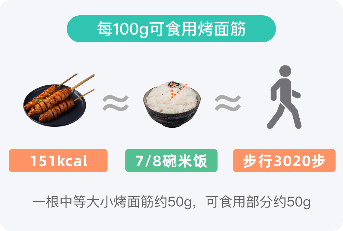 一根中等大小的烤面筋约重50g,其热量约为75.5kcal,相当于3/7碗米饭的热量。如果食用一根烤面筋,需步行大约1510步以消耗相应热量。具体的运动量会因个人体重、运动强度等因素而有所不同,可作为一般参考。