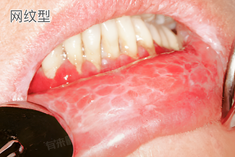 - 这是较为常见的一种表现形式,在口腔黏膜上会呈现出白色的、相互交织的细线条状或网状斑纹,形状如同树枝、网格一样,边界相对清晰,可分布在颊黏膜、舌背、唇红等部位,一般没有明显的疼痛感,患者往往是偶然发现口腔内出现了这样的斑纹。