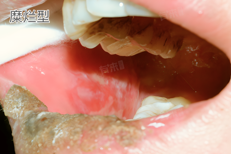 - 此型相对来说症状较为严重,口腔黏膜在疾病发展过程中出现破损、糜烂,糜烂面往往较小但数量可能不止一处,形状不规则,边界不清晰,表面有渗出物,呈现出淡黄色或灰白色,周围的黏膜组织会有红肿现象,看起来显得 “脏兮兮” 的。