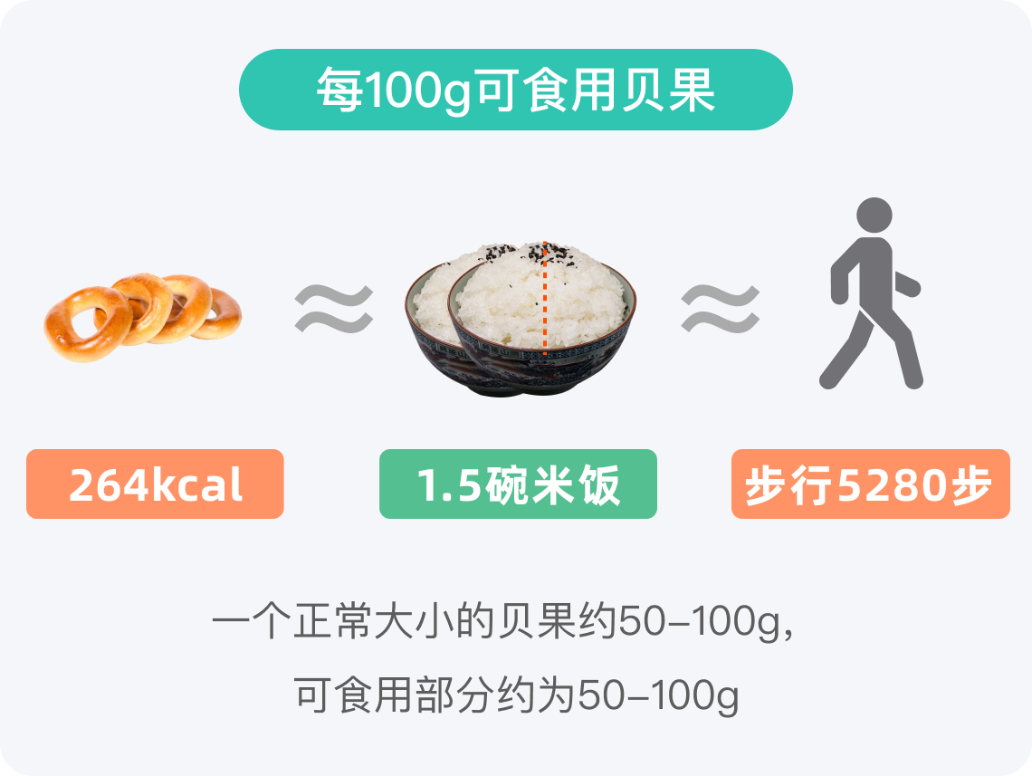 在营养学对食物热量的分类标准里,每100g可食用贝果热量为264kcal,这使其处于高热量食物范畴。一个正常大小的贝果约为50-100g,取75g的贝果来计算,可食用部分约75g,其热量约为198kcal,约等于1.1碗米饭。对于部分成年人一餐500-800kcal的热量需求而言,一个贝果所占的热量比例较大。
