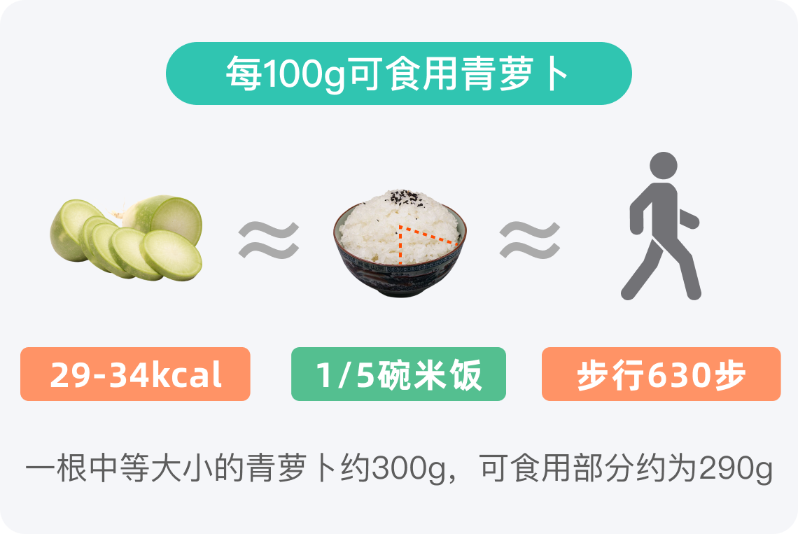 一根中等大小的青萝卜约300g,可食用部分约为290g,根据热量区间的均值进行计算,其热量约为91kcal。如果将热量进行等价换算,这相当于约1/2碗米饭的热量,这里米饭热量按116kcal/100g,每碗米饭150g进行计算,这一对比清晰地展示了青萝卜在热量控制方面的显著优势。