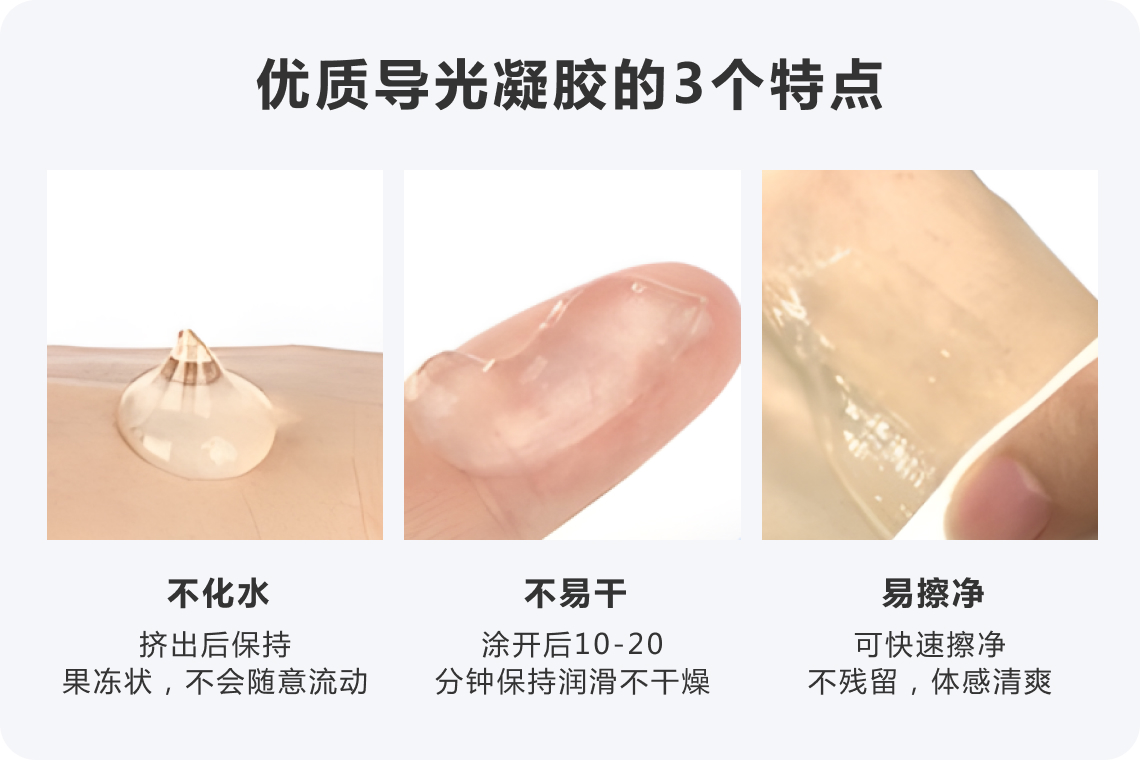 2、导光作用:在激光治疗等项目中,导光凝胶能够均匀地导入光源,使光线更加均匀地照射在皮肤上,从而提高治疗效果。
