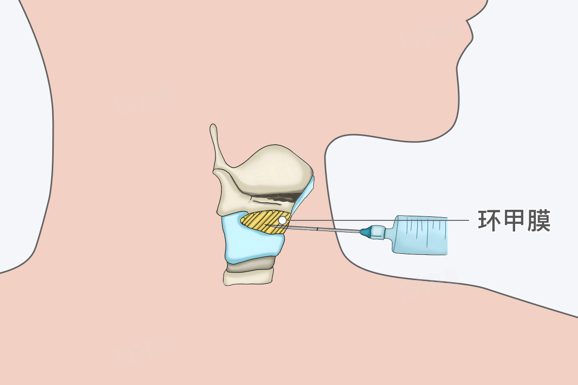 在进行环甲膜穿刺时,穿刺术者会左手触摸穿刺部位,拇指和中指绷紧穿刺点两侧皮肤,右手持环甲膜穿刺针或粗针头垂直刺入。注意用力不宜过猛,当针头通过皮肤、筋膜及环甲膜有落空感时,即表示针尖进入气管。此时取出针芯,挤压两侧胸廓时有气体自针头喷出,表明穿刺成功,然后适当固定穿刺套管。