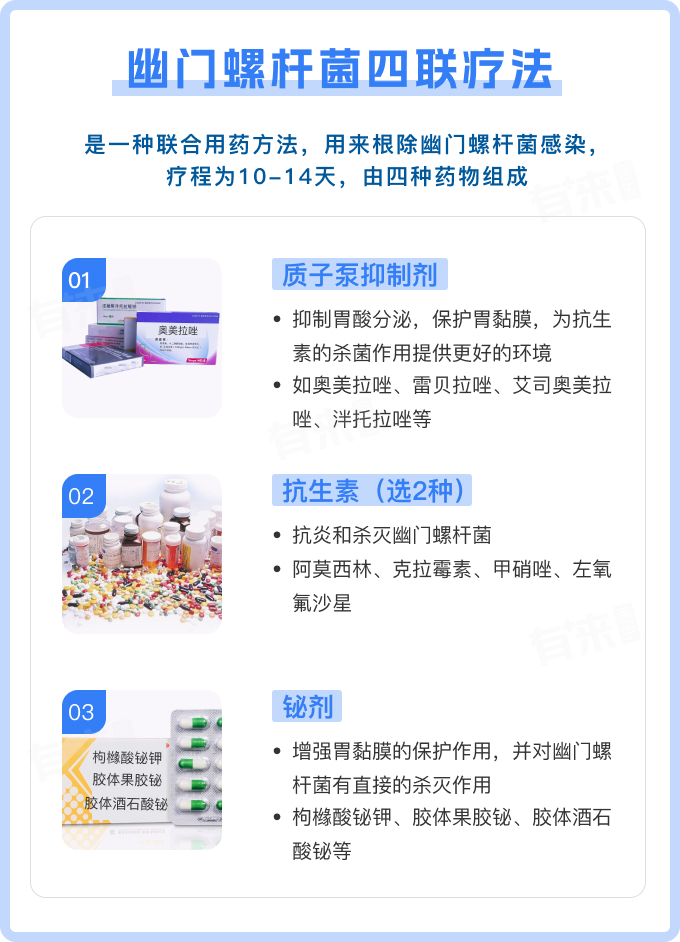 幽门螺杆菌四联药是用来根治幽门螺杆菌治疗方法的简称,常用四种药物联合治疗,其药物组合包括质子泵抑制剂(PPI)、铋剂以及两种抗生素,10-14天为一个疗程,抗生素应在餐后服用,而铋剂和质子泵抑制剂应餐前服用。