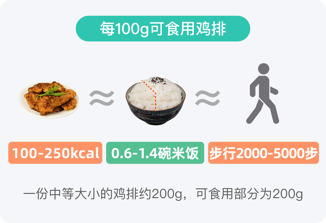 在营养学范畴内,每100g可食用鸡排的热量在100-250kcal,为中高等热量食物。一份鸡排其可食用部分为200g,热量是200-500kcal,相当于1.5-2.9碗米饭。对于成年人一餐500-800kcal的热量需求而言,一份鸡排可能就占据了较大的热量比例,需要谨慎搭配其他食物。