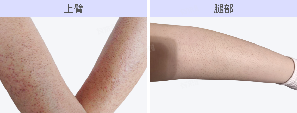 - 皮损主要发生在上臂、腿部,臀部、面部两侧、背部等部位也可能会出现,但相对较少。随着年龄的增长,部分患者的症状会有所减轻,主要集中在上臂和腿部等典型部位。