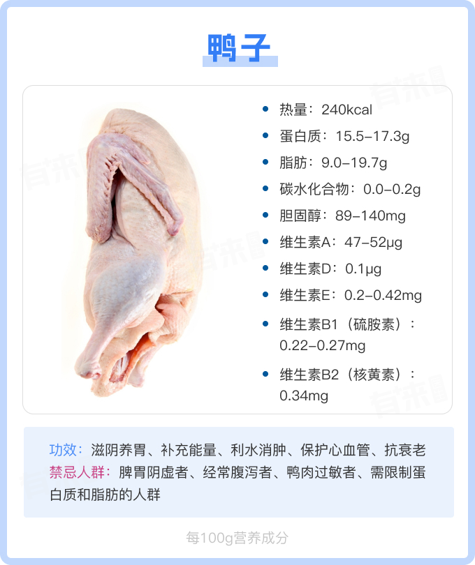 - 滋阴养胃:鸭肉性味甘咸而平和,中医认为它有滋阴养胃、利水消肿的功效,适合阴虚体质或者胃阴不足的人食用。