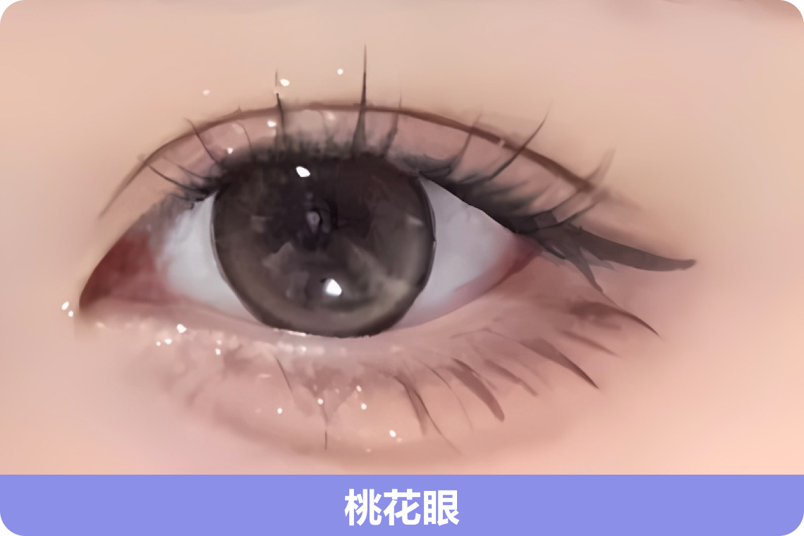 3、桃花眼:桃花眼因眼形似桃花而得名,眼型较长,眼尾略弯。上眼睑弯曲弧度较大,眼头深邃 ,眼尾略弯上翘或下垂。