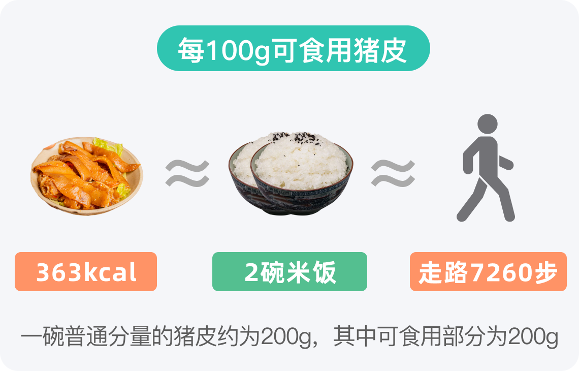 猪皮热量水平比较高,一碗200g的猪皮热量约为726kcal,大约相当于4.17碗米饭的热量。对于部分成年人,一餐热量需求约为500-800kcal,相比之下,一碗200g猪皮的热量在一餐中所占比例较高,占比91%-145%。可见,猪皮是高热量食物,食用时需要谨慎控制量,避免热量摄入过多对健康造成不良影响。