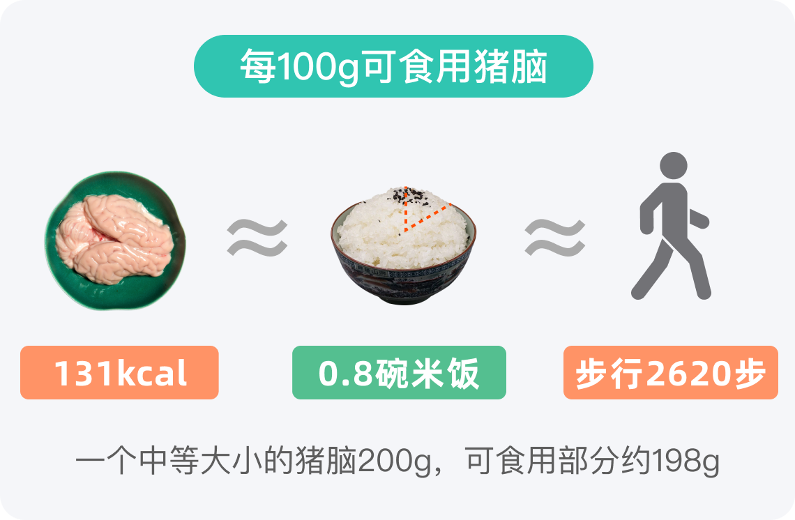 一个中等大小的猪脑200g,可食用部分约198g。按照每100g猪脑131kcal的热量计算,一个中等大小猪脑的热量就是259kcal。这个热量值相当于1.5碗米饭的热量,每碗米饭约150g。因此,适量食用猪脑并不会导致热量摄入过多,但需注意其高脂肪和高胆固醇的特性。