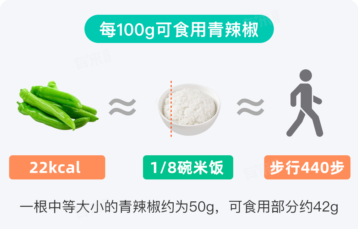 一根青辣椒约重50g,热量约为9kcal,大约相当于0.05碗米饭的热量,这个热量水平在普通成年人一餐中所占比例较低,但仍需控制摄入量。