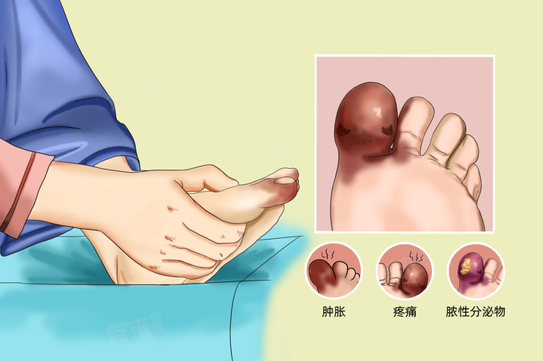 1天前脚趾伤口周围皮肤发黑、肿胀、发臭,发黑区域迅速扩散,于是紧急前往医院就诊。