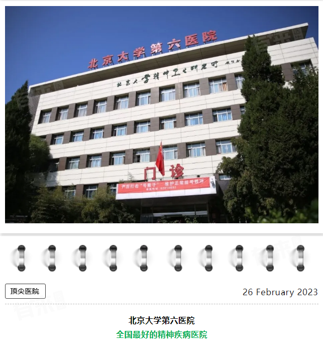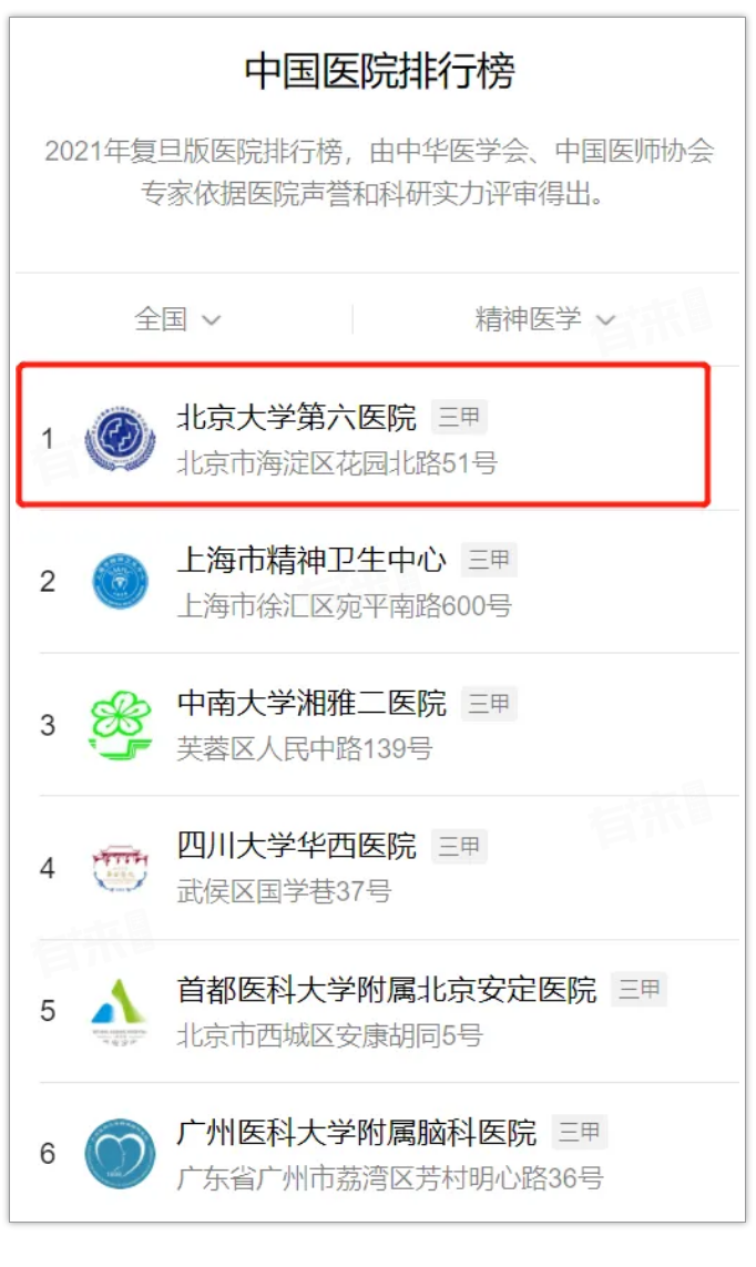在2021“复旦版中国医院综合排行榜”中,北京大学第六医院的精神医学专科排名第一。