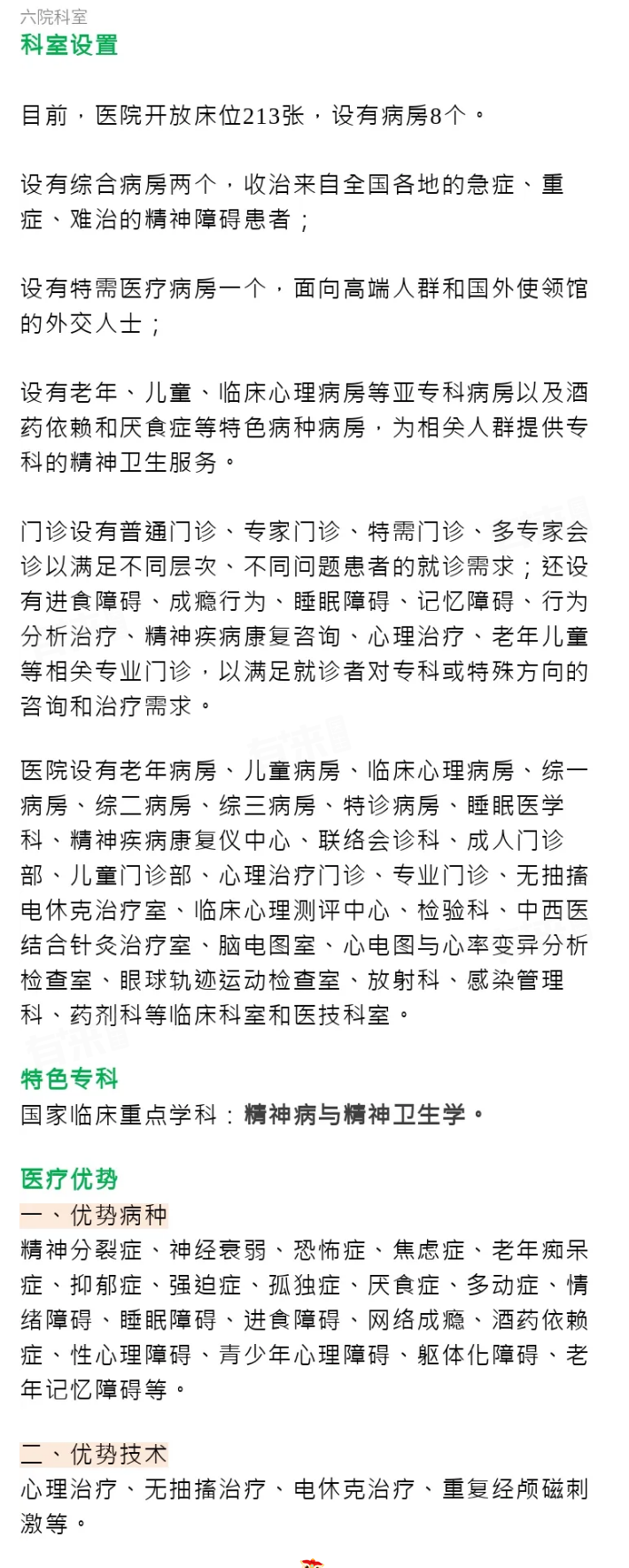 1,住院科室分别有:儿科,老年科,综合一科,综合二科,综合三科(心身医学科),临床心理,(前面的都在昌平院区),特诊科(在海淀院区)。