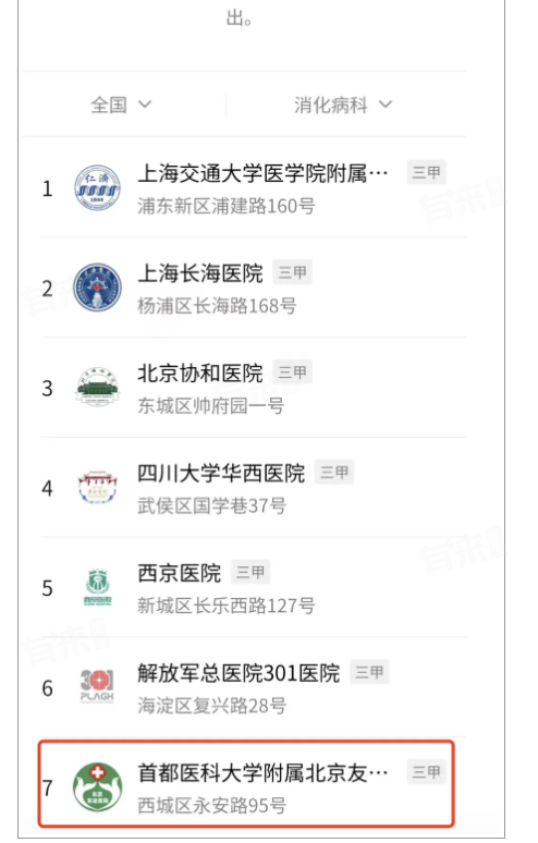 北京友谊医院在中国医院综合排名为第72位。全国消化病科排名为第七。