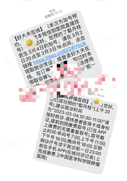 3月2日收到好大夫App的短信,加号成功(需要在短信内规定时间进入app领取就诊凭证),同时也收到了东肿的预约成功短信。