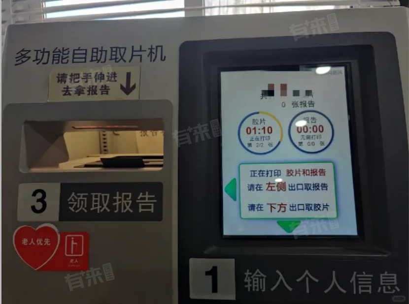 提前去医院人工窗口排队补胶片,交完钱去放射科门口登记,让我15:30来取片。