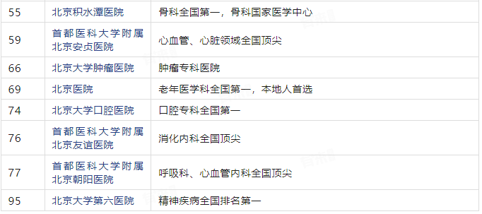 下表为全国排名前100的北京三甲医院,共计20家,数据来源2023于复旦大学研究所排名。