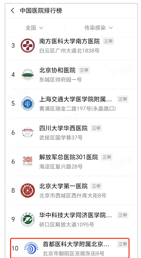 在复旦版中国医院专科排行榜中,北京地坛医院的传染感染专科排名第十。