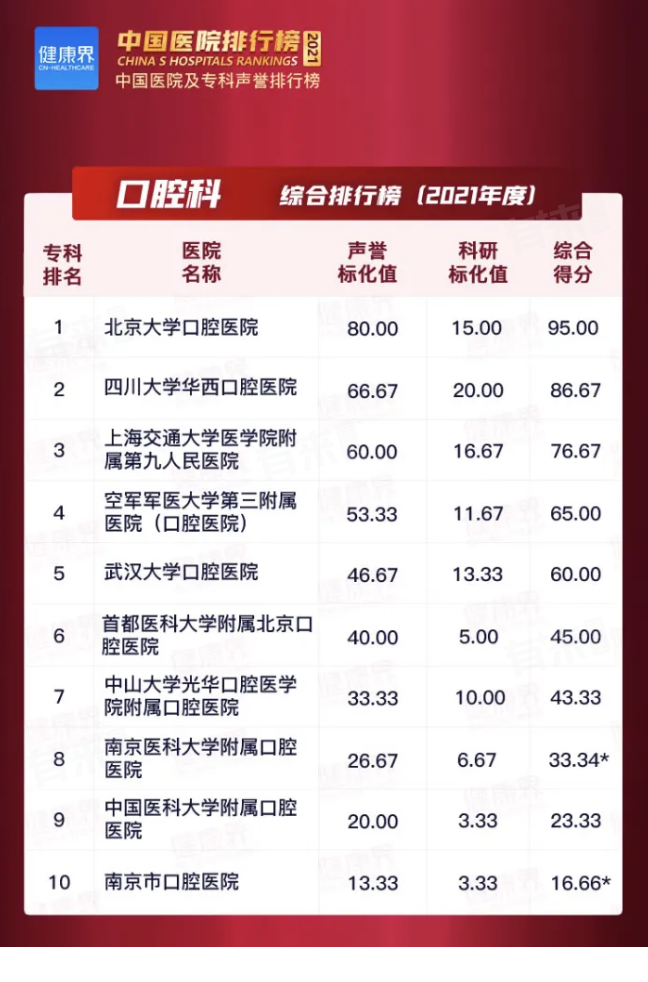 复旦版中国医院排行榜,北京大学口腔医院在口腔医学“专科综合排行榜”和“专科声誉排行榜”均荣列榜首,连续13年荣列口腔医学专科第1名。