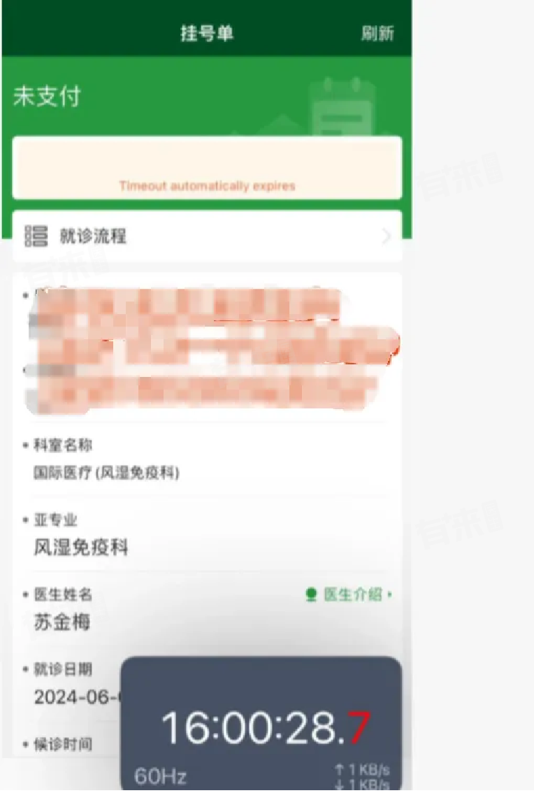 我是16:00:28(没错,就是要精确到毫秒)抢到的苏金梅医生的国际号,挂号费¥1200。