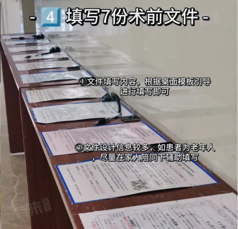 ③叫号后前往右侧医生处领取一系列申请手术单据;按照桌面表格模板参考填写完毕后,交回右侧医生处;