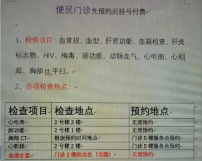 检查也很简单,抽血,尿检,心电图,心脏彩超,肺功能,在本院做了CT就不用再做了,一上午时间都能做好,做好检查和助理说一声,有异常她会和我联系。然后就给我发了住院前的宣教。