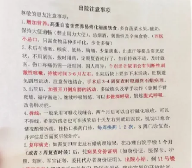 早上医生检查引流管咳嗽的时候不冒泡就可以顺利拔管出院,拔管的时候轻微疼痛,对比昨天一天的疼痛,第三天舒服很多,护士叮嘱21天后拆线拿大病理,不用特地挂主治医生,挂主治医生下面的人就可以,号比较好挂。