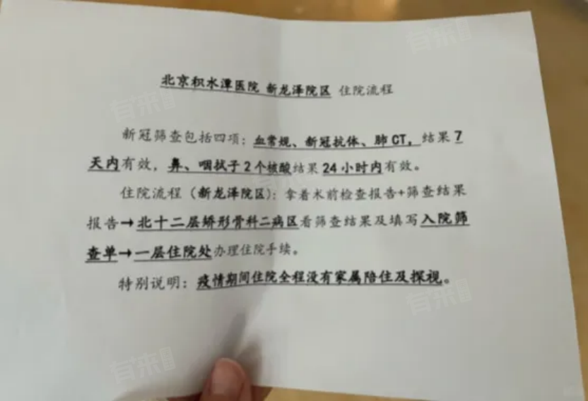 带上检查结果,(血常规,咽拭子,鼻式子核酸,CT)到北十二楼矫形骨科护士站,找到护士说是办理住院。