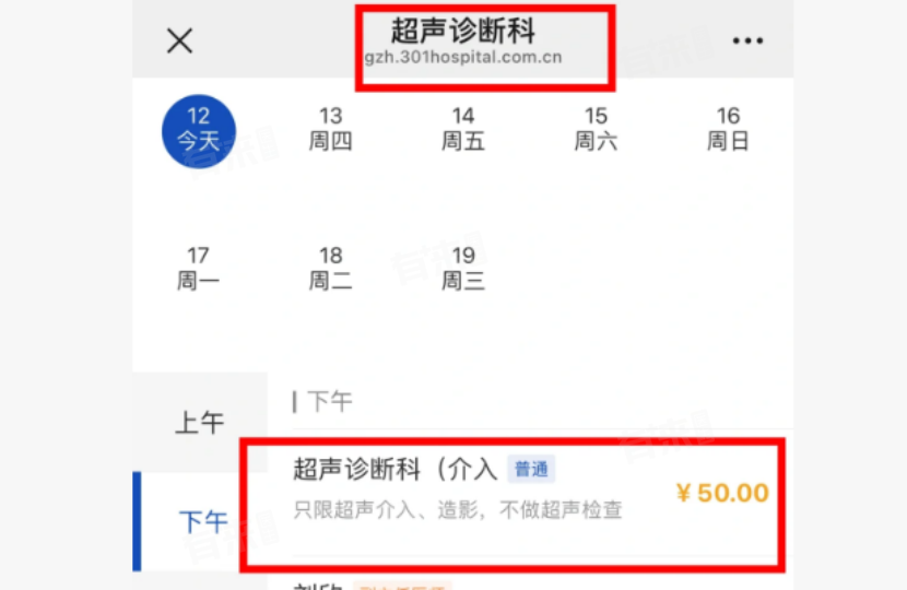 第一步:挂号,在公众号中国人民解放军总医院,选择科室-其他科室-超声诊断科-下午超声诊断介入(普通号)