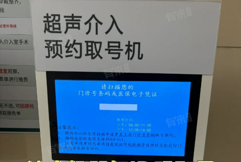 第五步:预约取号,拿前面说的ID条码和所有资料到601超声介入预约区,旁边的机器取号并等候叫号;