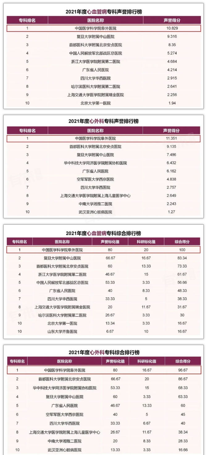 在复旦大学医院管理研究所发布的《中国最佳医院专科声誉排行榜》中,阜外医院心血管病、心外科均连续十一年蝉联第一。