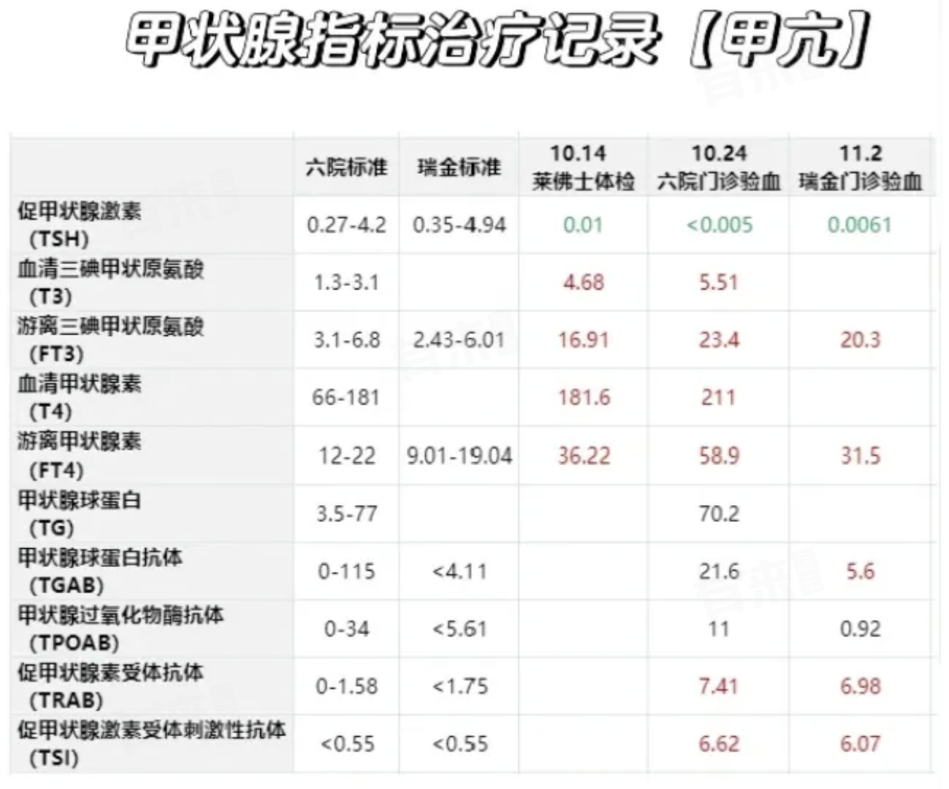 王医生给我耐心解释了:在治疗前期,这几个指标升高是很正常的。因为我之前T3,T4,FT3,FT4一直高,所以TRAB会一直往上走,必须要等到T3,T4,FT3,FT4都正常,甲功恢复正常,TRAB才会开始下降。