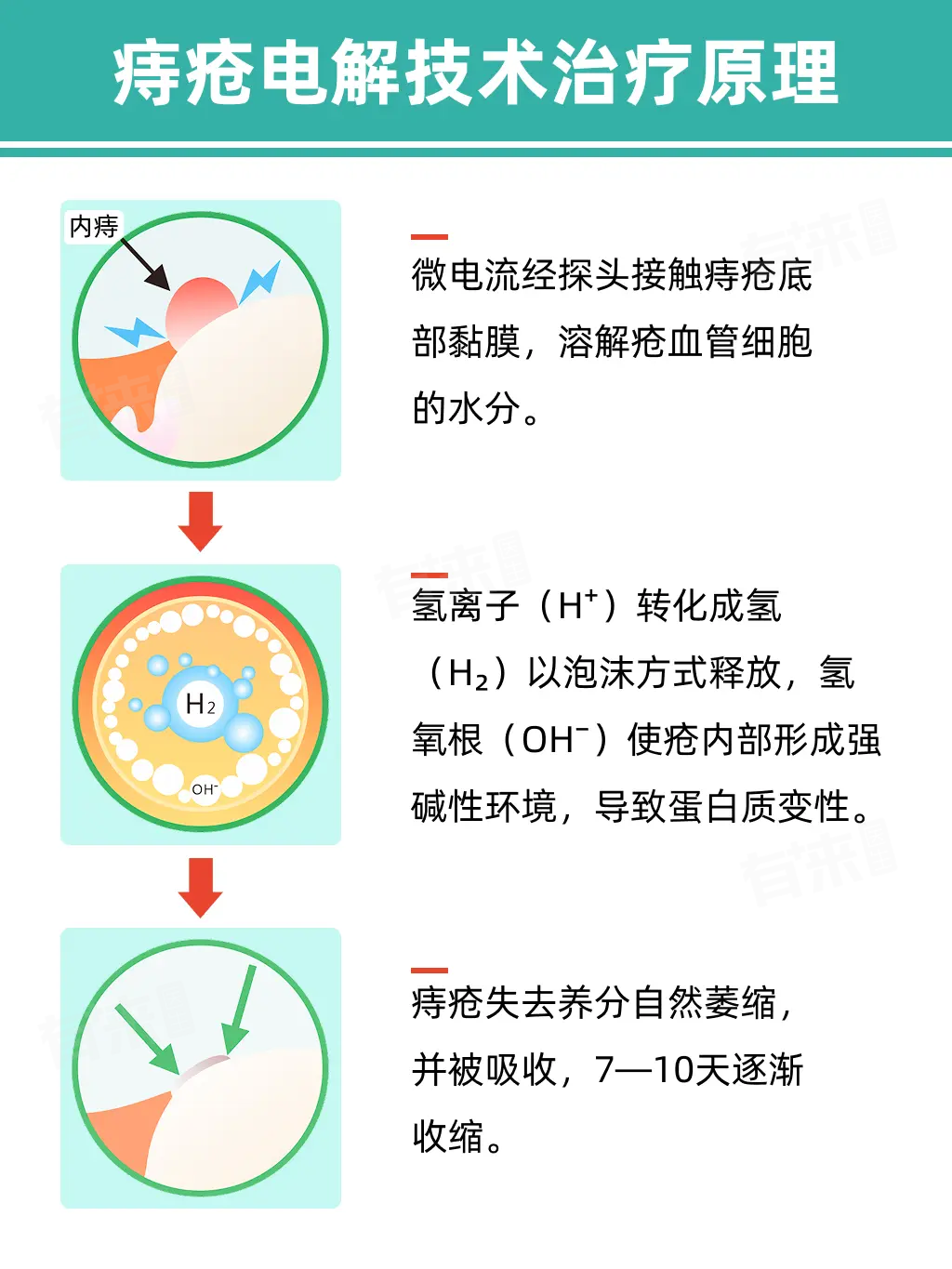 - 电解痔疮技术基于电化学原理,治疗时医生会将探头接触痔疮底部黏膜,通电后痔疮组织内的水分发生电离,产生氢离子和氢氧根离子,在局部形成强碱性环境。