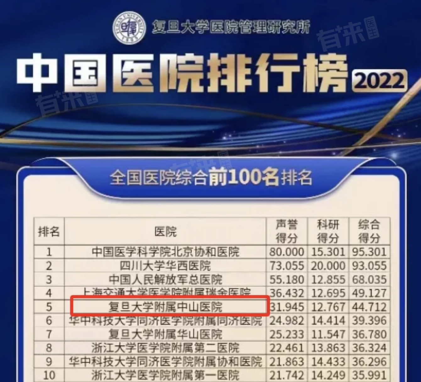 在最新发布的复旦版《2022年度中国医院综合排行榜》上,复旦大学附属中山医院排名第五,并且已经连续多年排名前五。