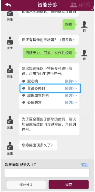 3、跟随页面提示,进入“智能分诊”页面,填写自己简单症状后,系统将会有科室挂号入口。点击科室挂号入口进入挂号。